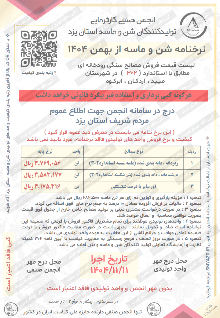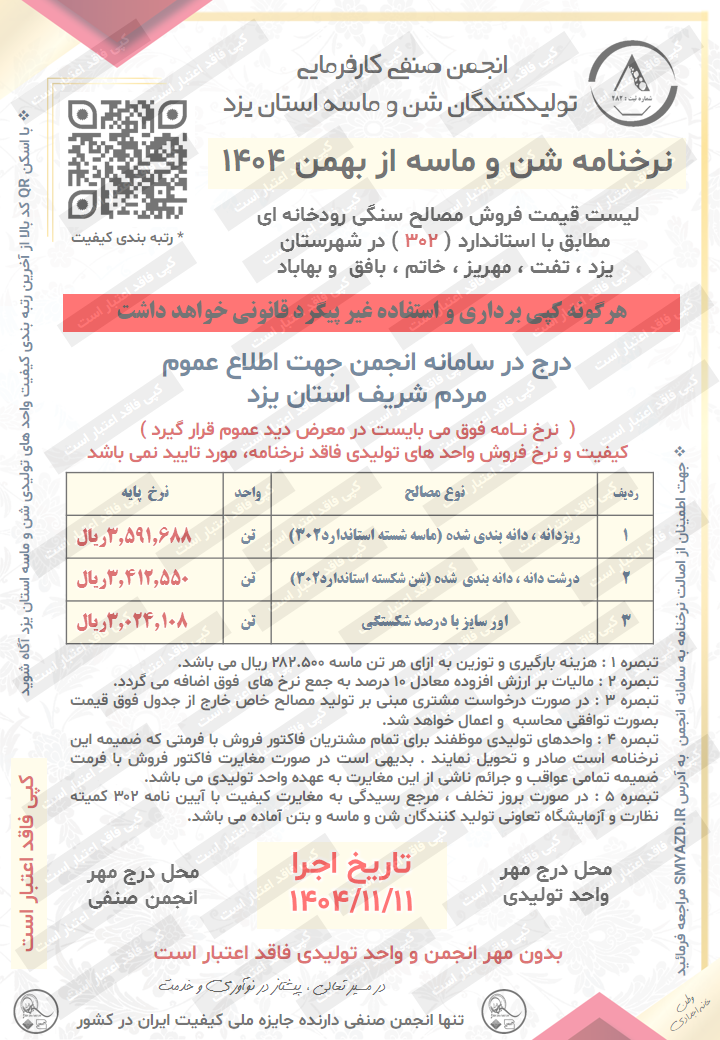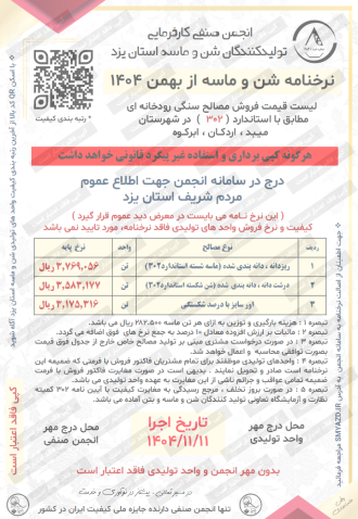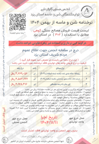 توجه : واحد های تولیدی سنگدانه استان یزد که فاقد نرخنامه با نام و کد شناسایی می باشند مورد تایید این انجمن نبوده و فاقد بررسی مسائل کیفی و فروش توسط خریدار از این نهاد است .